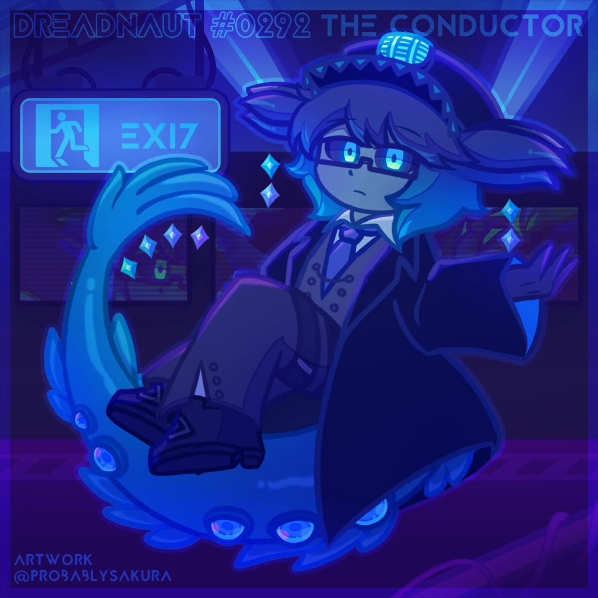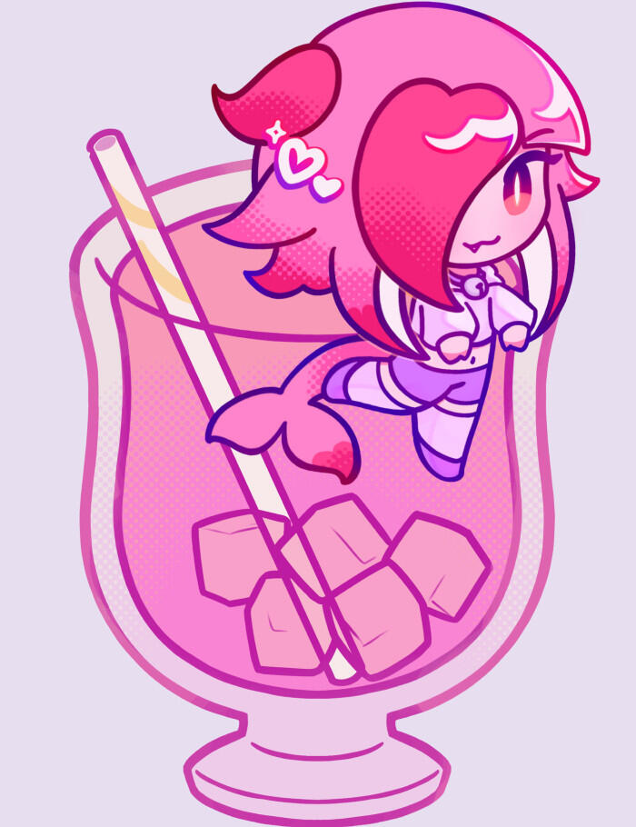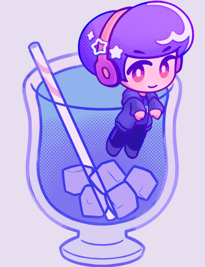 Final lineart and coloring. While the previous iteration was colored in CMYK, the final iteration was colored in RGB using saturated colors, halftones, and a pop art style.Hair highlights are stylized, featuring white shapes and sparkles with saturated outlines. The lines feature gradients to catch ridges of different features.