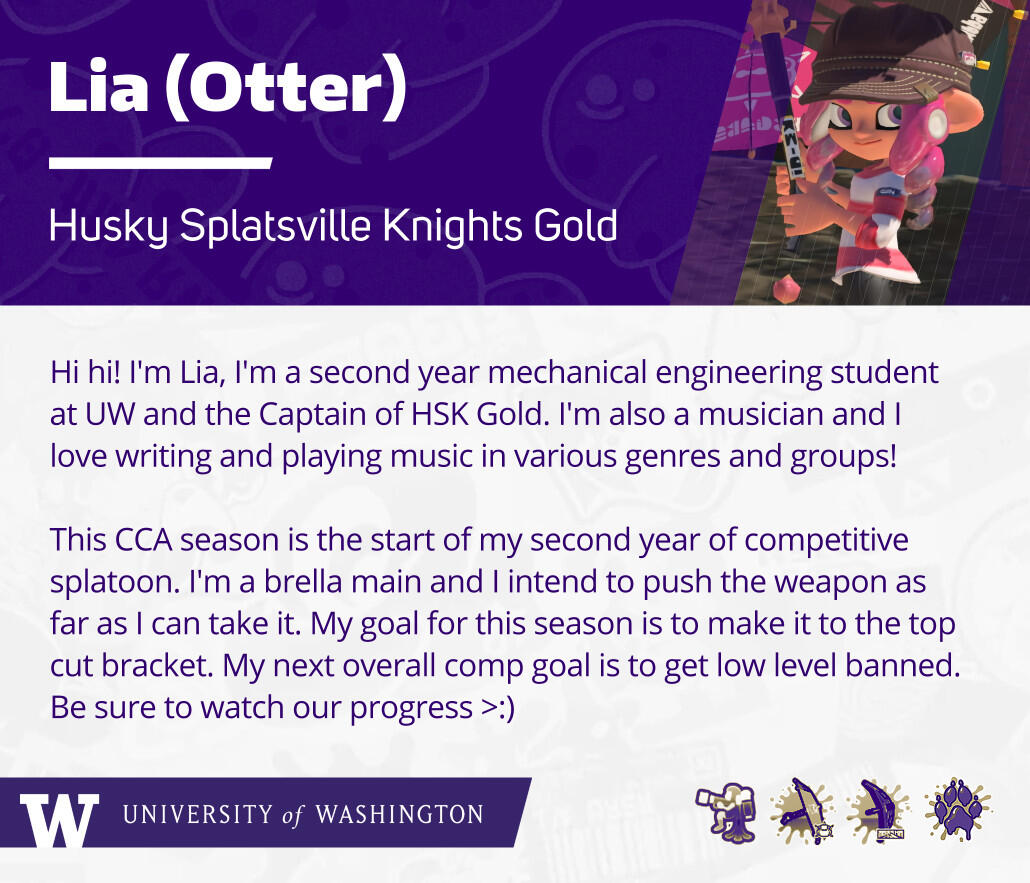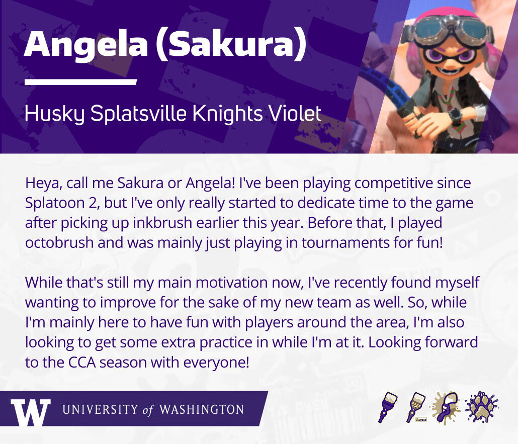 Graphics made for the UW Splatoon Club and the 'Husky Splatsville Knights' competitive esports team. Involved original game assets edited to match the UW color palette. Posted on the club's social media pages.
