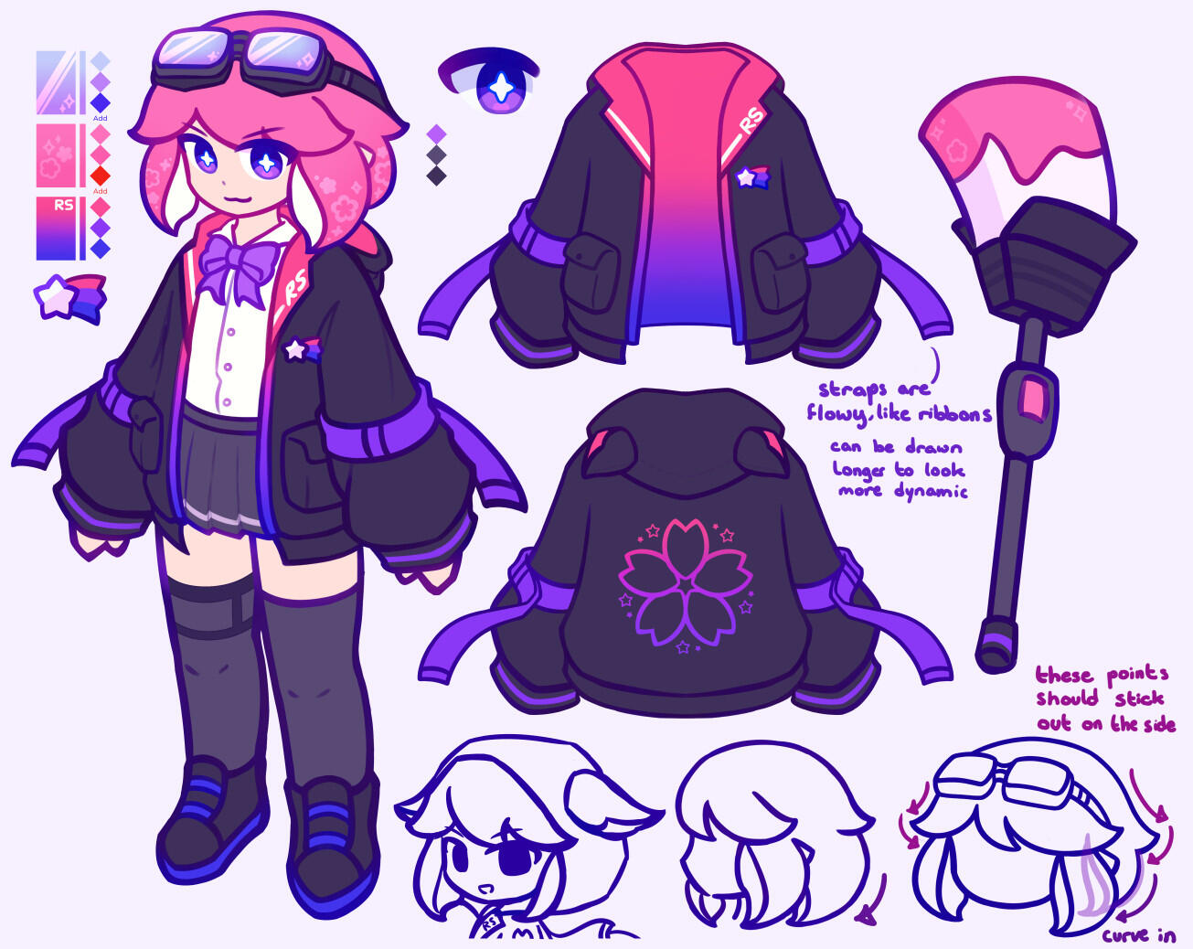Reference sheet detailing a personal character. Designed with the intent of being easy to draw for other artists.Details are limited to provide visual interest while keeping the design relatively simple. Main and accent colors roughly follow a 60-30-10 distribution.